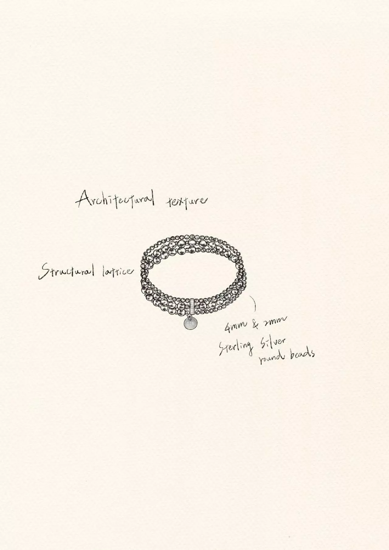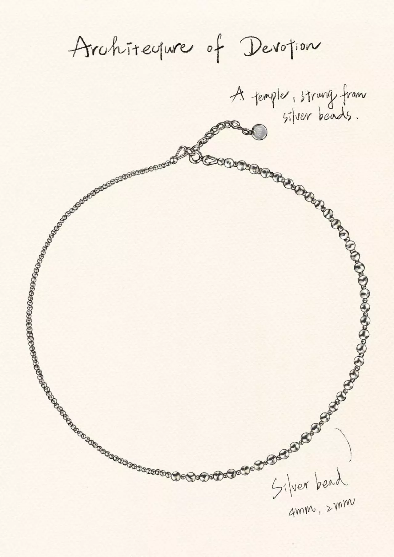 4毫米與2毫米的銀圓珠,依照嚴謹而富有節奏的序列被串聯,